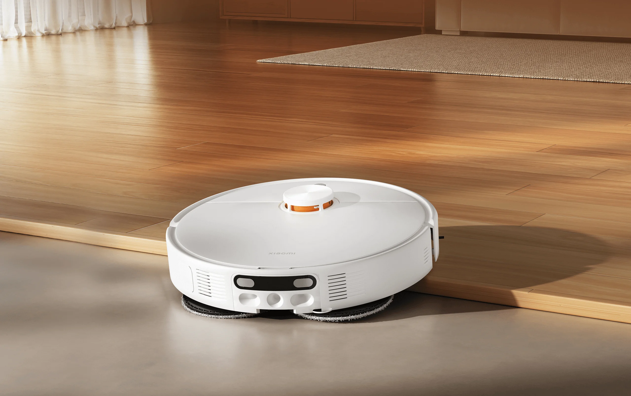Xiaomi Robot Vacuum H50 Pro выполнен в аккуратном минималистичном стиле с белым корпусом и яркими оранжевыми акцентами. Компактная высота позволяет устройству легко заезжать под мебель и эффективно убирать в труднодоступных местах.